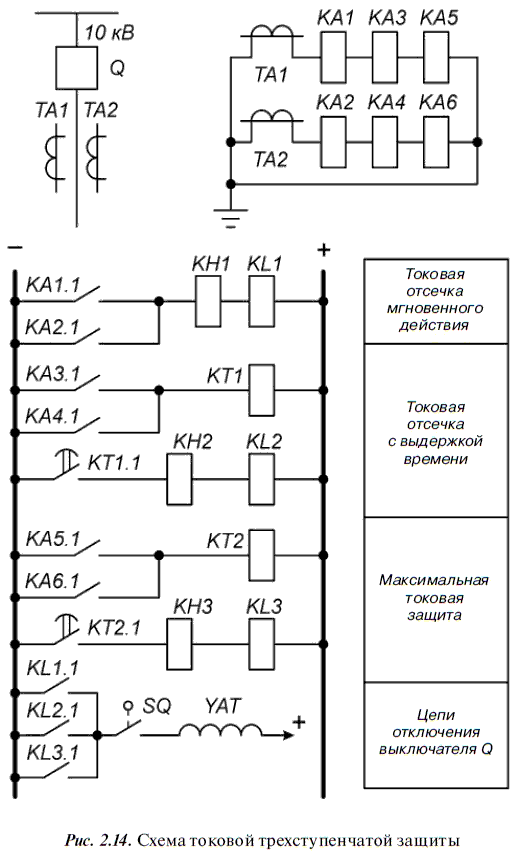 Базовая схема токовой трехступенчатой защиты, устанавливаемой на отходящей линии электропередачи 10 кВ, показана на рис. 2.14.