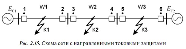 2.5.1. Принцип действияВ электрических сетях с двухсторонним питанием и в кольцевых сетях обычные токовые защиты не могут действовать селективно. Например, в электрической сети с двумя источниками питания (рис. 2.15), где выключатели и защиты установлены с обеих сторон каждой линии, при повреждении в точке К1 должны выполняться следующие условия выбора выдержек времени срабатывания МТЗ: