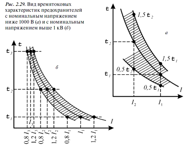Реальные времятоковые характеристики предохранителей могут отличаться от характеристик, предоставляемых заводами-изготовителями. Так, разброс времени срабатывания предохранителей с номинальным напряжением ниже 1000 В может достигать ±50 % (рис. 2.29, а). У предохранителей с номинальным напряжением выше 1 кВ для любого времени срабатывания отклонения значений тока срабатывания не должны превышать ±20 % (рис. 2.29, б) [3].