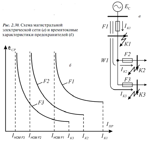 Например, в магистральной электрической сети с линией электропередачи W1 установлены три предохранителя F1, F2, F3 (рис. 2.30, а). Характеристика головного предохранителя F1 должна быть построена в диапазоне токов от нуля до значения тока в этом предохранителе при трехфазном КЗ в точке К1; характеристика предохранителя F2 на первом присоединении – до значения тока в этом предохранителе при трехфазном КЗ в точке К2;характеристика предохранителя F3 на втором присоединении – до значения тока в этом предохранителе при трехфазном КЗ в точке К3,как показано на рис. 2.30, б.Здесь t CP– время срабатывания предохранителя; I ПP– ток в предохранителе; I НОМ F1, I НОМ F2, I НОМ F3– номинальные токи предохранителей F1, F2, F3 соответственно; I K1, I K2, I K3– токи в предохранителях при КЗ в точках К1, К2 и К3 соответственно.
