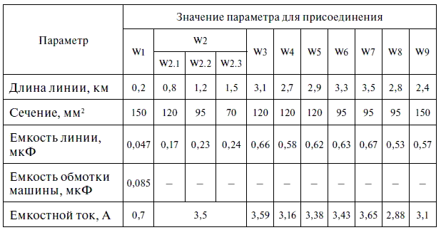 Здесь C W1= 0,047 мкФ – емкость кабельной линии W1, значение которой получено путем умножения удельной емкости кабеля [9] на длину линии (0,2 км); С м= 0,085 мкФ – емкость обмоток статора электродвигателя (табл. П9.1).