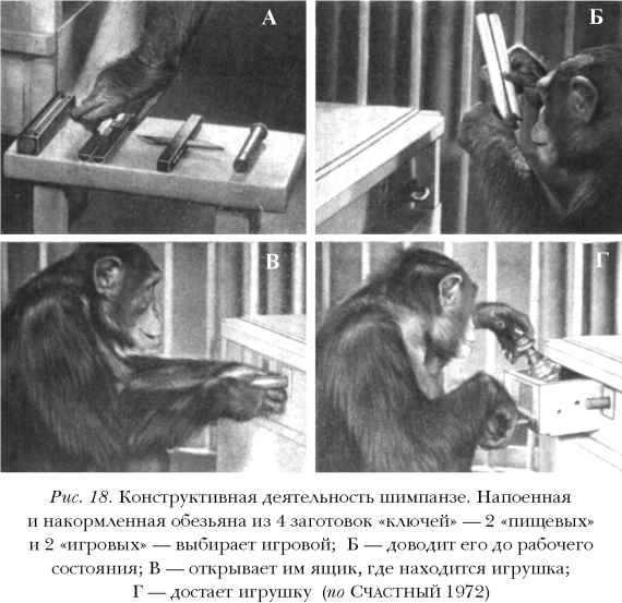 У всех обезьян сравнительно быстро образовалась связь между выбором определенного «ключа» и получением соответствующей пищи или игрушки. В основе подобного поведения лежал простой пищедобывательный условный рефлекс. Однако с нашей точки зрения одними только условными рефлексами дело не ограничилось, и в это поведение были вовлечены механизмы и более высокого уровня. Обезьяны в скором времени обнаружили способность переделывать «ключи» в зависимости от преобладающей в данный момент потребности. Если им хотелось получить игрушку, а ключи годились только для получения пищи, они видоизменяли предложенные им заготовки. Отметим кстати, что в этом случае поведение шимпанзе явно носило двухфазный характер (по Леонтьеву, см. выше): достижению цели предшествовали «подготовительные фазы» – серии промежуточных действий по обработке и подгонке будущего ключа (рис. 18).