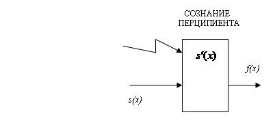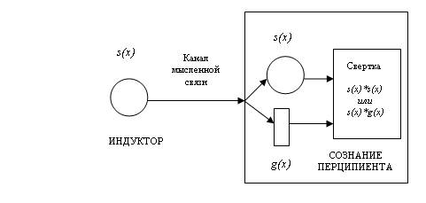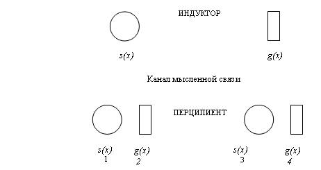Перципиент принимает информацию и идентифицирует ее, руководствуясь с одной стороны, лежащими перед ним кругом и прямоугольником – s(x) (здесь не имеет значения чем именно), а с другой – переданным по каналу мысленной связи сигналом от индуктора