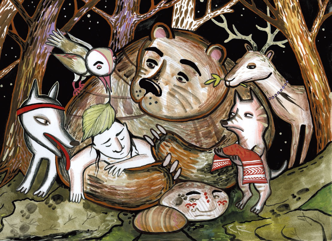 Давно ушёл из дому Синяя Родинка, и старуха мать решила пустить по следу его любимцев – ворона и сороку. Полетели они и вскоре вернулись с крошечным кусочком его тела. Старуха бережно положила его на постель сына и прикрыла шкурой. Потом вышла из палатки, раскурила трубку и промолвила: