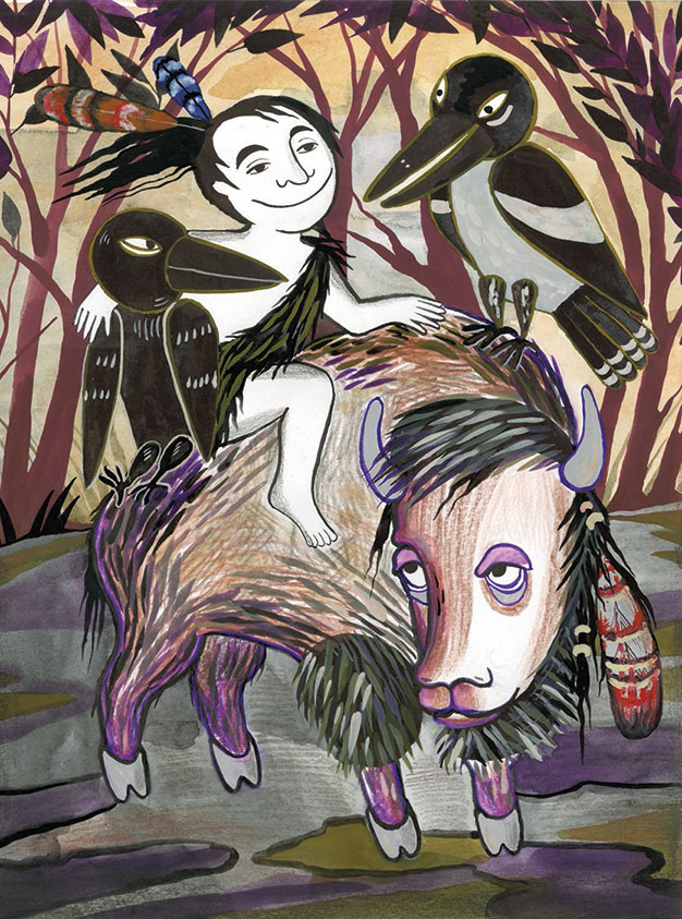 Отправились они в путь. Шли долго-долго и в конце концов набрели на индейскую деревню. Тут бизонёнок обернулся человеком и помчался играть с детьми. Наиграются дети и бегут по своим домам, а бизонёнок всегда спешил в лес, и никто в племени не мог понять, кто же он такой.