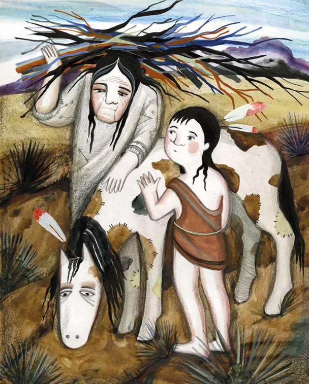 Однажды, после того как племя снялось с места, старуха с мальчиком плелись по тропе следом за другими. И набрели они на старую, измождённую клячу. Её конечно же оставил здесь кто-то из их соплеменников. Конь был тощий и совсем изнурённый, слепой на один глаз, спина вся потёрта, а передняя нога сильно распухла. Словом, был конёк таким никудышным, что никому даже в голову не пришло брать его с собой. Но когда старуха и её внук подошли к коню, мальчик сказал: