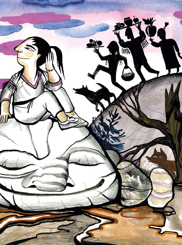Рано утром вся деревня последовала за Сиротой. Каждый принёс на прогалину мясо или хлеб и положил на камень. Люди сели в круг, и, когда они наконец затихли, камень заговорил: