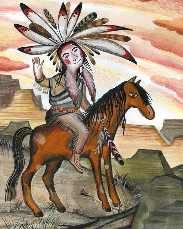 Теперь юноша был богатым и женился на красавице дочери вождя, а когда тот состарился, сам стал верховным вождём. Но он всегда заботился о своей бабушке и хранил свой старый вигвам. А на каурого садился только по праздникам, и тот шёл всегда рядом с вождём.
