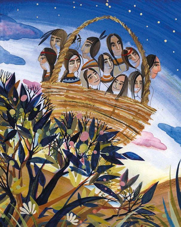 Одолело охотника любопытство: откуда это кольцо в прерии? Спрятался он в высокой траве и стал ждать. И вот послышалась откуда-то сверху тихая-тихая музыка. Глядит охотник: что-то спускается прямо с неба. Сначала это было лишь малое пятнышко, потом пятнышко превратилось в большую корзину, а в ней – вот чудо! – двенадцать прекрасных девушек-сестёр.