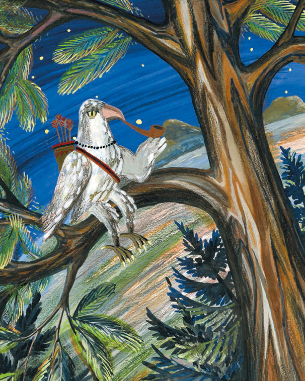 Поднял Орёл Черепаху на высоту большого дерева. А Черепаха заявляет, что этого мало: надо подняться ещё повыше! Наконец оказались они на большой высоте. Говорит тогда Черепаха: