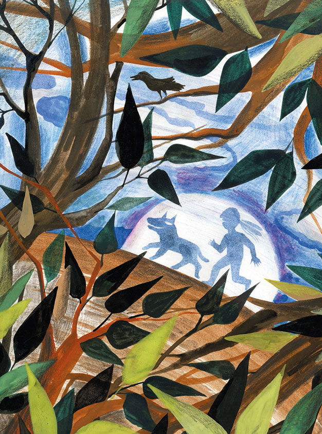 Сильно опечалился мальчик и решил отправиться на поиски зверька. Шурин показал ему место, где пёсик скрылся между горами, и мальчик пошёл в ту сторону. Наконец он напал на его след и увидел остатки красной краски, которой пометил пёсика. А зверёк тот был непростой! На самом деле был он сыном волчьего вождя, и был он послан в помощь мальчику. И оттого что хозяин покрасил своего волчонка, его и теперь можно было узнать по рыжим лапам и морде. Долго шёл мальчик по тропе и вышел к озеру. На другом берегу виднелась большая деревня, которая растянулась далеко-далеко. Оттуда доносился громкий шум, словно множество людей затеяли игры. Это было очень большое озеро, и мальчик подумал: «Как же мне перебраться на тот берег?»