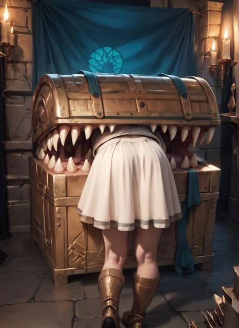 Из приоткрытого и почему-то клыкастого сундука торчала пара девичьих ног в белых гольфиках и круглая девичья задница в короткой юбке.