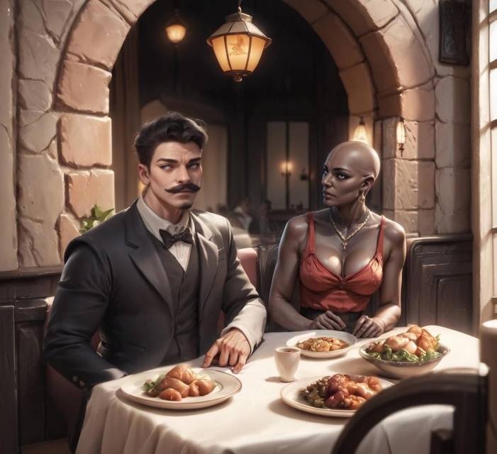 Драгоценная цепь на изящной шее, золотые серьги с красными рубинами в ушах, открытое декольте и тяжелые груди, грациозная осанка и ровная спина… Экзотичная, для этих краёв, тёмная, шоколадно-оливковая кожа… И абсолютно лысый череп, словно дань каким-то африканским традициям.