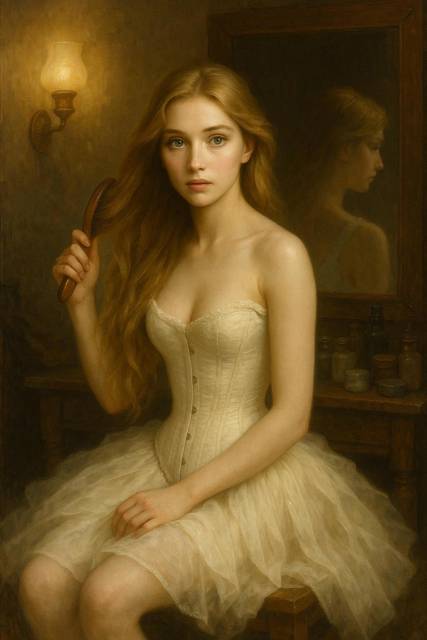 Незнакомка расчёсывала волосы, сидя на деревянной скамейке без спинки, одетая лишь в белый корсет, подчёркивающий небольшую юную грудь, и пышную юбку, напоминающую балетную пачку, и была похожа на сказочное существо, а не настоящую девушку – то ли фея, то ли нимфа…
