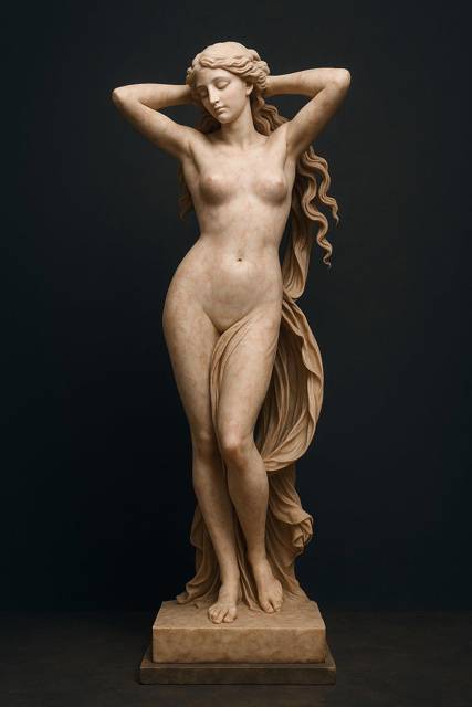 Чуть выше человеческого роста, вырезанная из бледного, почти светящегося розоватого мрамора, с тонкими прожилками, будто сосуды под кожей, скромно, под светом настенного светильника стояла стройная и как будто гибкая фигура женщины. Её волосы стекали по плечам волной, руки подняты, будто она откидывает их назад, подставляя грудь ветру или морскому бризу. Лицо с прикрытыми веками, с полуулыбкой, словно у богини, которая знает о своей неземной красоте, и совсем не против, чтобы на неё смотрели вечно.