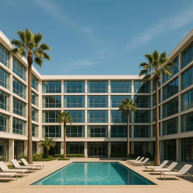 Панорамные окна, пальмы, бассейн, аккуратный фасад… Уменьшить 120 «клеток» до условно 70-ти одно– и двухкомнатных номеров, сделать несколько люксов на пятом этаже. Поменять коммуникации, электрику, сделать парковку, фойе, небольшой ресторанчик и кухню. Оборудовать номера мебелью, что-то уровня «IKEA + кастом».