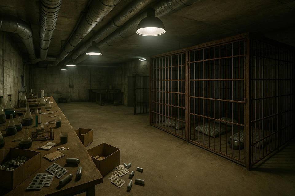 В дальнем углу подвала высились до потолка металлические клетки с толстыми ржавыми прутьями, больше похожие на камеры предварительного задержания из моего времени. Дверки камер были распахнуты настежь, а на полу я заметил смятые полосатые матрасы и металлические миски с водой. По моей спине пробежал предательский холодок от осознания, кого именно держали в этих камерах и для чего, и я непроизвольно нахмурился ещё сильнее.