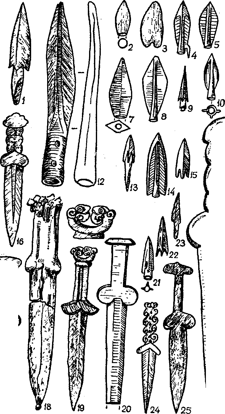 Оружие сакского времени: 1 – костяной наконечник стрелы (могильник Усть-Буконь, Восточный Казахстан); 2 – костяной наконечник стрелы (могильник Тасмола II, Центральный Казахстан); 3– костяной наконечник стрелы (могильник Карамурун II, Центральный Казахстан); 4, 5, 6 – бронзовые наконечники стрел (могильник Карамурун I, Центральный Казахстан); 7, 8 – бронзовые наконечники стрел (могильник у дер. Юпитер, Восточный Казахстан); 9, 21, 22 – бронзовые наконечники стрел (могильник у с. Матвеевка, Западный Казахстан); 10 – бронзовый наконечник стрелы (Чиликтинский могильник, Восточный Казахстан); 11 – бронзовый наконечник .стрелы (могильник Карамурун I, Центральный Казахстан); 12 – бронзовый 'наконечник копья (случайная находка близ г. Иссык, Семиречье); 13, 15– бронзовые наконечники стрел (могильник Бесшатыр, Семиречье); 14 – бронзовый наконечник стрелы (случайная находка в Чимкентской области, Южный Казахстан); 16 —бронзовый акинак (случайная находка близ г. Кокчетава, Северный Казахстан); 17 – железный акинак (могильник Жаман-Тогай, Южный Казахстан); 18 – железный акинак (могильник Бесшатыр, Семиречье); 19 – железный акинак (случайная находка, Семиречье); 20 – бронзовый акинак (случайная находка близ г. Степняка, Северный Казахстан); 23 – бронзовый наконечник стрелы (могильник Карамурун II, Центральный Казахстан); 24 – бронзовый акинак (случайная находка близ г. Павлодара, Восточный Казахстан); 25 —бронзовый акинак (могильник Усть-Буконь, Восточный Казахстан); 26—бронзовый акинак (могильник Нурманбет IV, Центральный Казахстан).