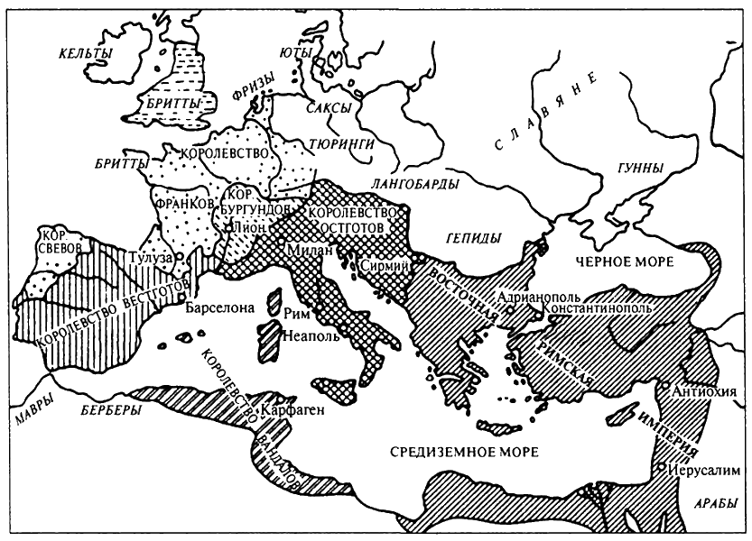 В предыдущих главах охарактеризованы события, которые привели к изменению политической карты Европы: на той территории, которую прежде занимала Западная Римская империя, возник ряд варварских королевств. Согласно традиционной, широко распространенной в исторической литературе точке зрения, смещение последнего западноримского императора и формальное утверждение политической самостоятельности варварских королевств знаменовали собой переход от Античности к Средневековью. Согласно марксистской историографии эти события представляли собой составную часть того социального переворота, который означал в рассматриваемом регионе смену рабовладельческого строя феодальным.