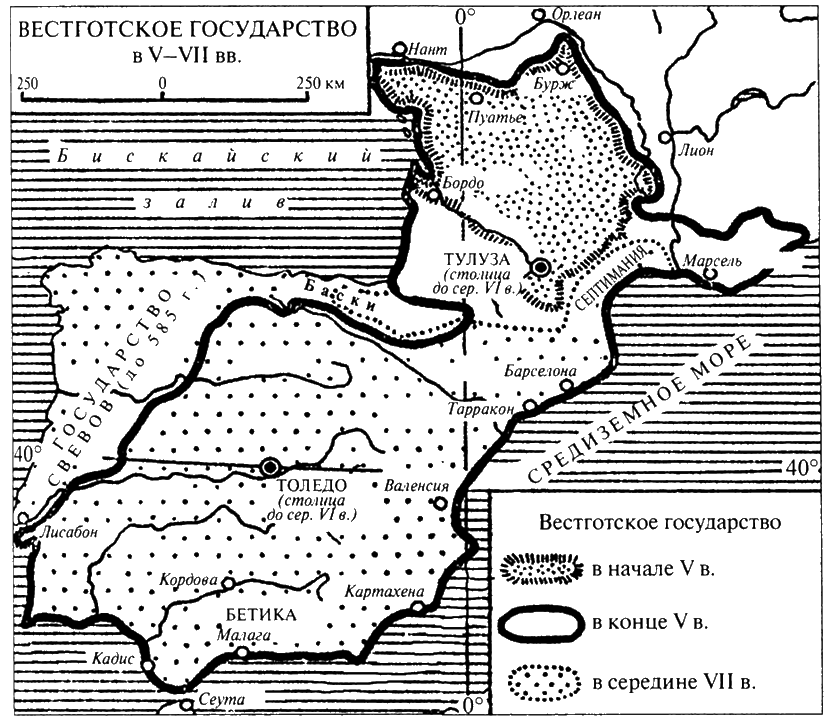 Правление короля Леовигильда (568–586) характерно успешной завоевательной политикой, направленной на присоединение к Вестготскому государству различных областей полуострова. К началу правления Леовигильда в руках византийцев находились Бетика и часть Картахенской провинции, а Галисия и Северная Лузитания принадлежали Свевскому королевству. Независимость сохраняли области басков, а ряд районов нынешней Астурии, Кастилии, Андалусии управлялись местными магнатами или племенными вождями. Ле-овигильд в течение нескольких лет вел военные действия против византийцев и в конечном счете отнял у них Севилью, Кордову и захватил всю Бетику. Он занял в Кантабрии Амайю (очевидно, в провинции Бургос), область, где правил некий Аспидий, Саларию (в районе Саламанки и Саморы), подчинил себе Ороспеду (на юго-востоке полуострова). Леовигильд, как отмечалось выше, положил конец самостоятельности Свевского королевства и превратил его в провинцию Вестготского государства. Он подавлял восстания басков на северо-востоке страны. Для внутренней политики Леовигильда характерно стремление усилить центральную власть и ограничить самостоятельность магнатов, преодолеть разобщенность готов и местного населения в праве, религии, общественной жизни.