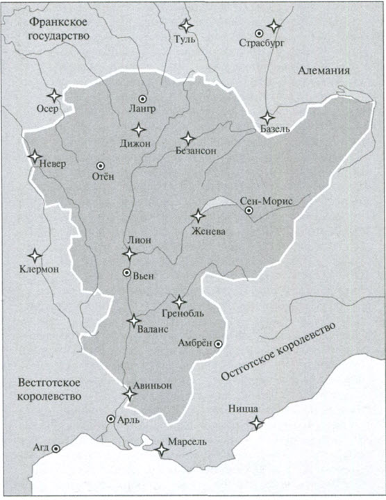 После смерти Гундиоха бургундское государство было разделено между его четырьмя сыновьями. Внутренняя борьба за престолонаследие сотрясала государство, пока на трон не вступил Гундобад (480–516), при котором Бургундия достигла вершины своего могущества. События развивались следующим образом.