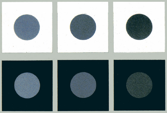 Однако в данном случае контраст имеет тенденцию к исчезновению. Пока эти пятна достаточно велики и мы рассматриваем их одновременно, взаимодействие их остается заметным; при этом мы замечаем и пограничный контраст, о котором пойдет речь несколько ниже. Но если эти пятна достаточно малы или воспринимаются с большого расстояния, то возникает их оптическая смесь, и мы видим общий серый тон как сумму черного и белого.