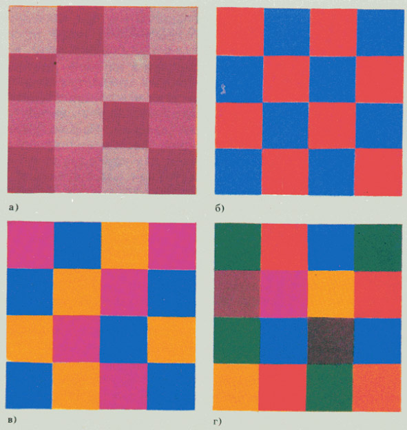 Очень существенна и важна для построения цветового изображения в целом способность цветовой композиции создавать за счет светлоты, цветового тона и насыщенности собственный рисунок. На таблице 31 приведены образцы, состоящие из набора одинаковых цветных квадратов. На верхнем образце квадраты расположены в таком порядке, что одни из них, будучи более темными, образуют фигуру в виде буквы «О», воспринимаемую как бы на фоне остальных квадратов. На нижнем образце эти же квадраты расположены в ином порядке, и мы уже не воспринимаем рисунка. Этот принцип цветовой композиции важную роль играет в мозаике.