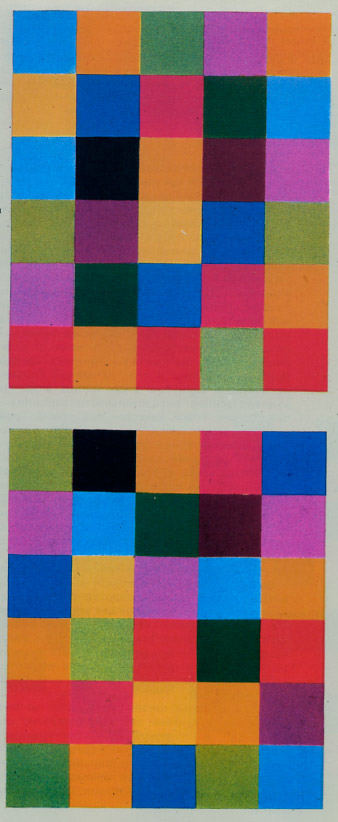 Очень существенна и важна для построения цветового изображения в целом способность цветовой композиции создавать за счет светлоты, цветового тона и насыщенности собственный рисунок. На таблице 30 приведены образцы, состоящие из набора одинаковых цветных квадратов. На верхнем образце квадраты расположены в таком порядке, что одни из них, будучи более темными, образуют фигуру в виде буквы «О», воспринимаемую как бы на фоне остальных квадратов. На нижнем образце эти же квадраты расположены в ином порядке, и мы уже не воспринимаем рисунка. Этот принцип цветовой композиции важную роль играет в мозаике.