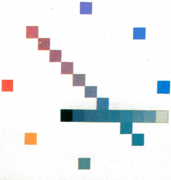 Очень существенна и важна для построения цветового изображения в целом способность цветовой композиции создавать за счет светлоты, цветового тона и насыщенности собственный рисунок. На таблице приведены образцы, состоящие из набора одинаковых цветных квадратов. На верхнем образце квадраты расположены в таком порядке, что одни из них, будучи более темными, образую фигуру в виде буквы «О», воспринимаемую как бы на фоне остальных квадратов. На нижнем образце эти же квадраты расположены в ином порядке, и мы уже не воспринимаем рисунка.