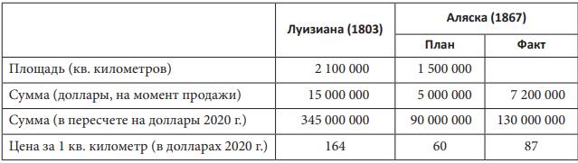Сегодня трудно сказать, чем именно руководствовались участники совещания, назначая подобную сумму. По современным меркам, она довольно скромная – около 90 млн долларов в пересчете по курсу 2020 года (впрочем, следует понимать, что при уровне цен 1867 года это были значительно более существенные деньги, особенно если учесть, что они должны были выплачиваться золотом). За эту сумму Петербург предполагал уступить территорию площадью более чем 1,5 млн кв. километров. Вполне вероятно, что цену назначали исходя из опыта других подобных приобретений Вашингтона. Например, в 1803 г. Луизианская покупка[188]188