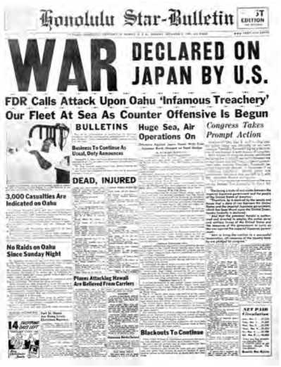 Газетный заголовок о вступлении США во Вторую мировую войну.