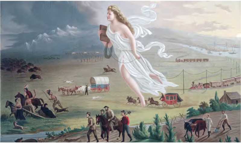 Знаменитая картина Джона Гаста «Американский прогресс» (или «Шествие Америки»; 1872 год) стала воплощением метафоры «манифеста судьбы», который и сегодня оказывает серьезнейшее влияние на умы американцев. На картине аллегорическая Америка в виде женщины в белом ведет поселенцев на Запад. В одной руке она держит учебник, в другой – телеграфный провод.