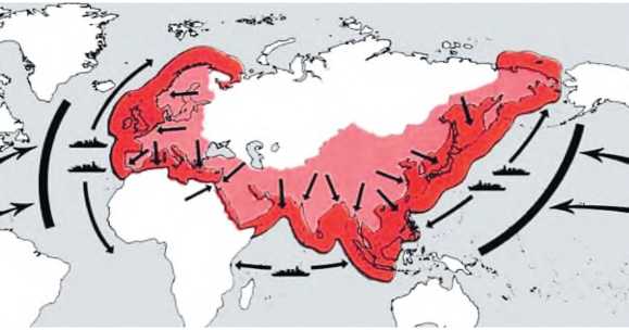 Реализация американских геополитических подходов и идей глобального переформатирования мира хорошо прослеживается на примере создания в период холодной войны так называемой петли анаконды – сети военных баз, опоясывавших СССР по периметру его границ и сохраняющихся в настоящее время.
