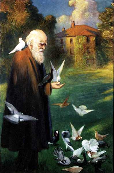Ватагин изобразил Ч. Дарвина, кормящего голубей различных пород на лужайке перед своим домом в Дауне. Ученый сам ставил эксперименты по селекции на этих птицах для доказательства теории искусственного отбора. На примерах искусственной селекции он обосновал два фундаментальных положения, на которых базировалась его теория эволюции. Прежде всего, было показано, что особи одного вида могут существенно отличаться друг от друга: в этом плане домашние животные различаются гораздо сильнее, чем дикие. Кроме того, наглядно демонстрировалось, что новые свойства живых организмов могут передаваться следующим поколениям. Успешное выведение новых пород доказывало наследование признаков.