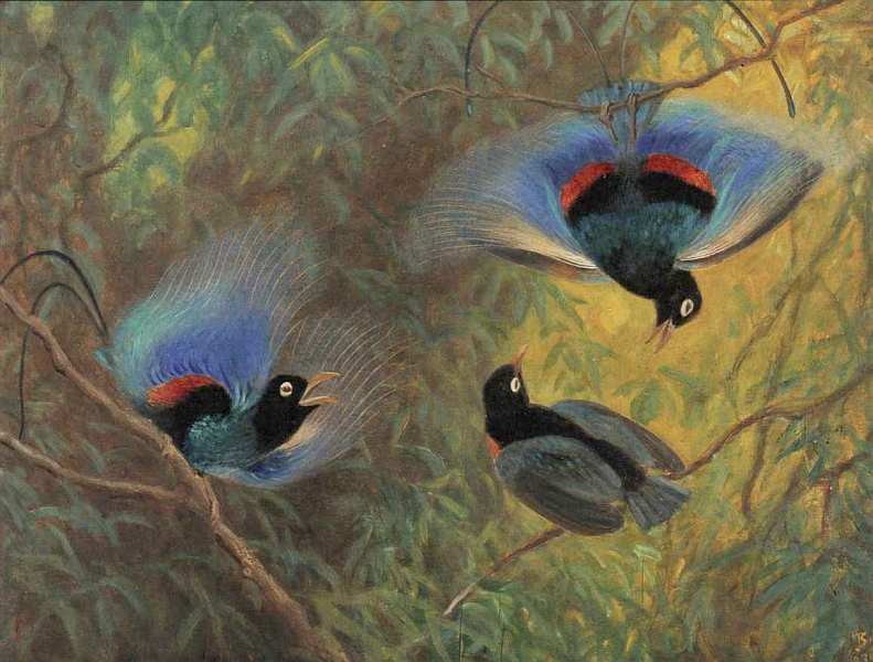 Работы художника прекрасно иллюстрируют еще один аспект учения Дарвина – половой отбор: «Эта форма отбора определяется не борьбой за существование по отношению к другим существам или к внешним условиям, но борьбой между особями одного пола, преимущественно самцами, за обладание особями другого пола. В результате получается не смерть неуспешного борца, а ограничение или полное отсутствие у него потомства».