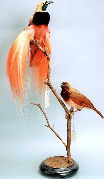 Пурпурная райская птица. Paradisaea raggiana. Самец и самка Таксидермист – Ф. Е. Федулов. Коллекция А. Ф. Котса