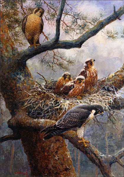 На картине изображены два взрослых сокола-сапсана возле своего гнезда с тремя птенцами. Этих птиц можно было бы назвать самыми совершенными среди пернатых. Во всяком случае, среди хищных птиц они занимают не менее важное место, чем тигр, лев или леопард среди хищных млекопитающих. Только у соколов можно видеть такое замечательное сочетание силы, ловкости, отваги, быстроты и изящества полета. Они нападают на добычу открыто, развивая рекордные скорости, как правило, не обращая внимания на неподвижных или мертвых животных. Сапсан – чемпион лёта на короткие дистанции, во время воздушной атаки он развивает скорость до 300 км/ч.