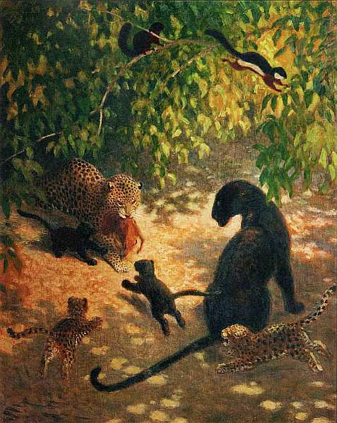 Давно известно, что в пределах одной популяции некоторых видов можно выделить несколько устойчивых из поколения в поколение групп особей, четко отличающихся по каким-либо внешним признакам (главным образом, по окраске). Классическим примером такого видового диморфизма являются леопарды, среди которых часто встречаются меланисты – особи с черным цветом шерсти. При этом животные, принадлежащие разным морфам, могут свободно образовывать друг с другом брачные пары. На картине В. А. Ватагина изображено потомство такой смешанной пары, причем одна половина детенышей – черная, а другая – светлая с черными пятнами. В лесу, среди игры света и тени, звери менее заметны, если на их шкуре имеются пятна или полосы. Такая окраска носит название расчленяющей, поскольку скрадывает контуры тела животного.