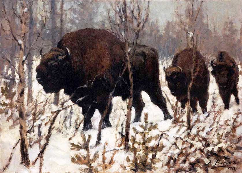 Константин Константинович Флёров (1904–1980) Беловежские зубры 1963. Картон, масло, 69x49