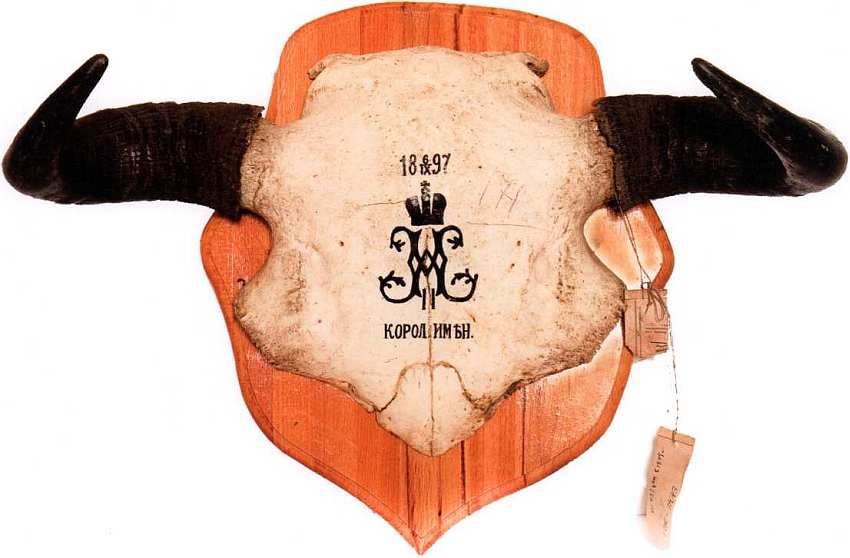 Рога зубра на лобной кости, на медальоне, с датой «6.IX.1897» и вензелем Николая II. Bison bonasus
