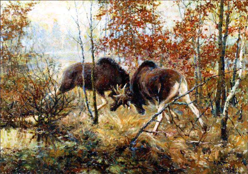 Самцы млекопитающих устраивают соревнование за самок, они демонстрируют не наряд, а силу. На первом плане в центре картины изображена схватка двух лосей в осеннем лесу. Опустив головы и расставив ноги, они яростно сшиблись рогами. Этим мощным оружием лоси не пользуются для защиты от хищников, а лишь в битвах за право обладания стадом самок. Однако в поединках самцы рискуют получить значительные ранения, что увеличит их шансы в последующем потерять свое стадо, проиграв другому самцу, еще не участвовавшему в турнире. Поэтому животные перед тем, как начать сражение, демонстрируют силу, издавая крики, показывая сопернику рога. И во многих случаях, видя противника, он покидает поле боя без борьбы.
