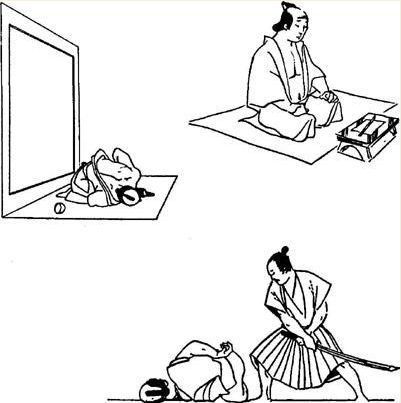 Итак, сэппуку отличается от обычного обезглавливания (как поступали с преступниками) тем, что приговоренный к смерти сам убивает себя. В определенных случаях (особенно вошедших в практику при Токугава) кайсяку наносил смертельный удар сразу же, как только осужденный наклонялся за лежащим на подносе кинжалом. Так погибли сорок семь ронинов, заслужившие в народе славу воинов, до конца преданных долгу. Им было позволено избегнуть ненужной боли (ведь само вспарывание живота сопровождается страшными муками и не приводит к немедленной смерти). Пример другого рода явил знаменитый мастер чайной церемонии Сэн Рикю, которому Хидэёси, по до сих пор неизвестной причине, приказал совершить сэппуку, в противном случае пригрозив казнить на площади. Рикю, вспоров себе живот, нашел силы еще и для того, чтобы отрезать часть кишки и приказать отослать ее на подносе Хидэёси. Несомненно, что подобное поведение, свидетельствовавшее о несокрушимости духа и способности переносить жестокую боль, сделало бы честь любому самураю.