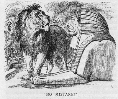 Британский лев укоряет Дизраэли (в образе Сфинкса) за его отношение к болгарской резне.