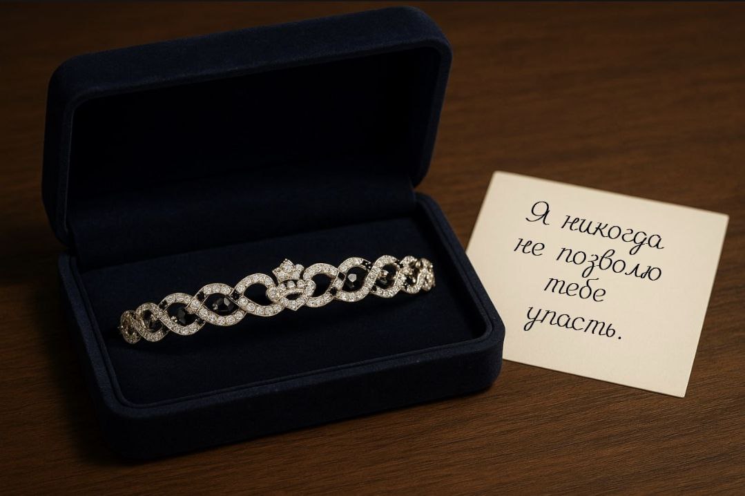 Внутри лежал браслет – тонкий и ослепительный, цепочка из бриллиантов и чёрных камней, переплетённых в сложный, потрясающий узор.