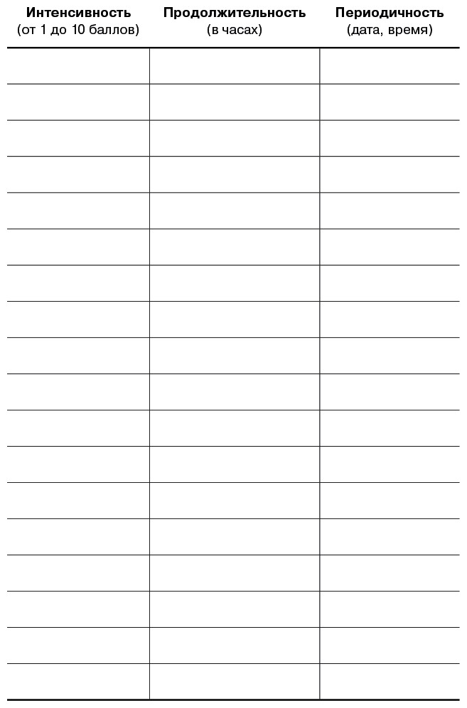 В первом столбце графика по 10-балльной шкале фиксируется интенсивность приступа раздражительности, тревоги или гнева, где 10 – самый высокий уровень, 1 – самый низкий. Чтобы оценка была более объективной, баллы нужно выставлять, оценивая силу проявления эмоции или чувства, вне зависимости от значимости события, которое их спровоцировало. Необходимо абстрагироваться от ситуации и задать себе вопрос: «Насколько сильное напряжение, беспокойство я ощущаю в данный момент?» или «Насколько сильный гнев я испытываю?».