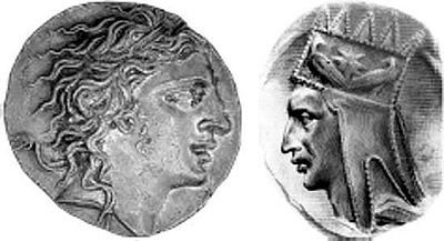 Рис. 13.2. Слева: портрет Митр и дата на монете 75–74 гг. до н. э. По мере нарастания кризиса изображение Митридата с дико растрепанными волосами на монетах становилось более похоже на Диониса, чем на Александра; судя по всему, монеты чеканились в спешке. Серебряная тетрадрахма, 1944.100.41479, передана Э.Т. Ньюэллом, Американское нумизматическое общество. Справа: Тигран Великий. Getty Images
