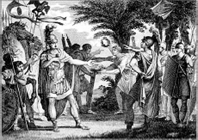 Рис. 13.3. Помпей (слева) принимает командование в Митридатовых войнах от Лукулла (справа). Гравюра, Августин Мирыс, 1750 г.
