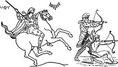 Рис. 14.2. Амазонки, воинственные женщины-кочевники, изображались в классическом греческом искусстве вооруженными копьем и луком. Они одевались в леопардовые шкуры, облегающие штаны, туники и персо-фригийские колпаки «свободы». Рисунок с изображения на вазе в «Веке сказаний» Т. Булфинча (1897) и Смита (1873).