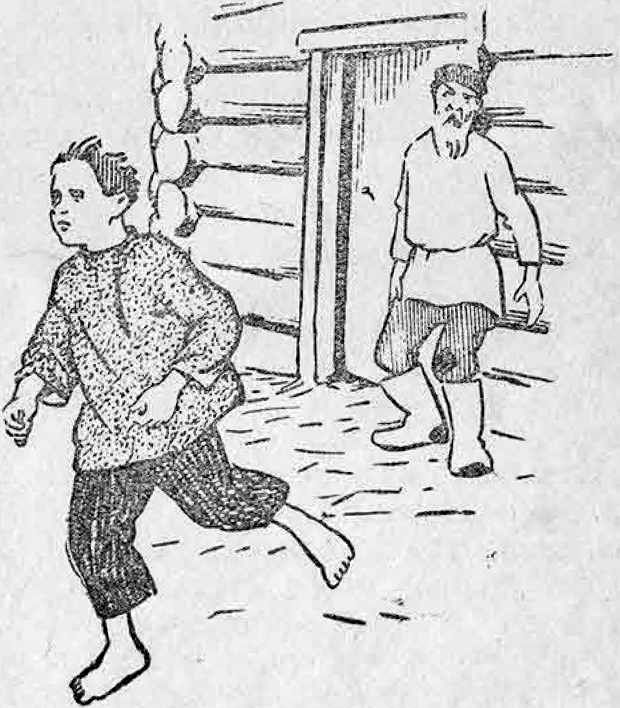 На дворе трое стоят шушукаются: Яшуха, картуз на лоб натянув, исподлобья выглядывает, да топориком по телеге постукивает; отец, в землю глядя, соломинку вертит в руках, а дед бородой да рубахой пестрядинной трясет, сердится: смолкли, увидев Ларьку, по сторонам заоглядывались.