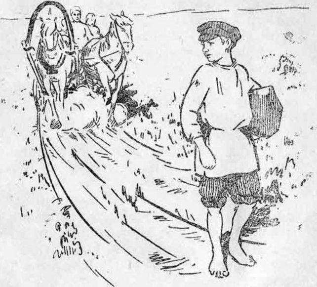 Пройдя несколько верст, коммунары рассыпались, сломав стройные ряды. Знамена положили на телеги идущего сзади обоза. Кто сел на воз, кто забежал вперед, кто в сторону от дороги. Дети рвали цветы и ловили насекомых. Ларька, задумавшись, отстал от обоза и тихо брел один по дороге. Вдруг он заметил, что кто-то сзади догоняет их на паре лошадей. Ларька почему-то заинтересовался догонявшими их людьми и все время оглядывался назад, замедляя шаг.